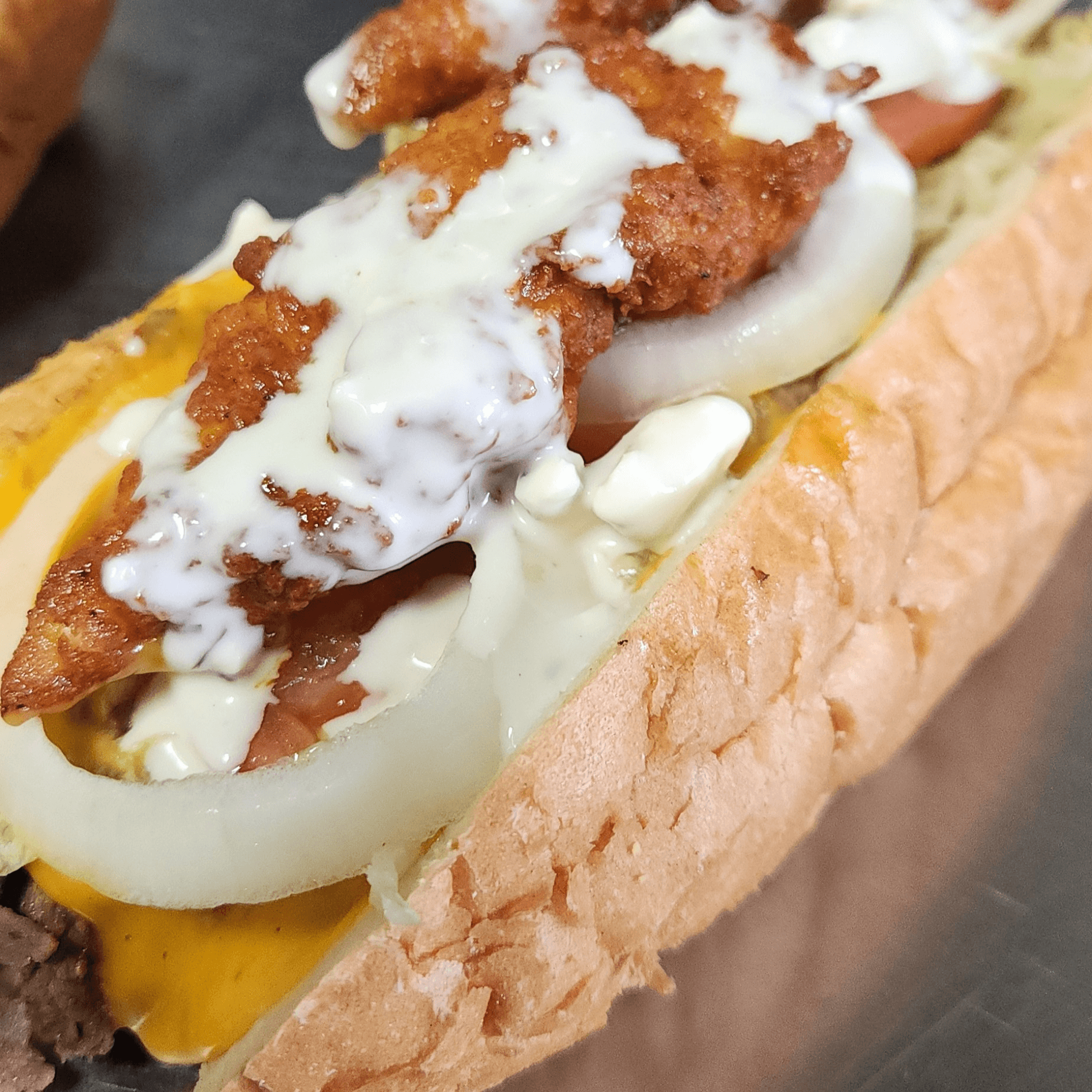 Shaved loin tail beef grilled hot and tender, topped with rich cheese sauce and two crispy buffalo tenders, finished with fresh lettuce, onion, and tomato, then drizzled with cool blue cheese dressing for the perfect balance of heat and creaminess.